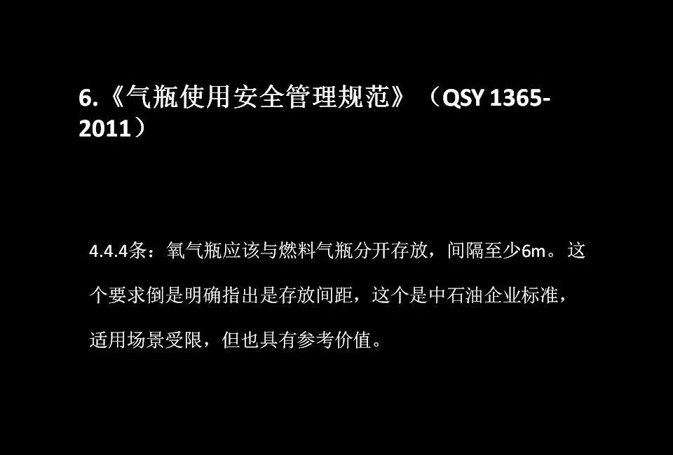 《氣瓶搬運(yùn)裝卸儲(chǔ)存使用安全規(guī)定》(GB34525-2017)未做規(guī)定,是否意味著此距離可繼續(xù)放寬? 而從風(fēng)險(xiǎn)管控的角度看,乙炔和氧氣,一個(gè)易燃一個(gè)助燃,是必須留有一定安全距離的,根據(jù)企業(yè)現(xiàn)場(chǎng)環(huán)境不同和對(duì)風(fēng)險(xiǎn)承受能力的不同,企業(yè)適當(dāng)?shù)膹膰?yán)管理是很有必要的。 但在安全生產(chǎn)檢查中,每一條隱患的提出都應(yīng)有依據(jù)作為支撐,對(duì)此,必須謹(jǐn)慎對(duì)待,并做進(jìn)一步的研究。
